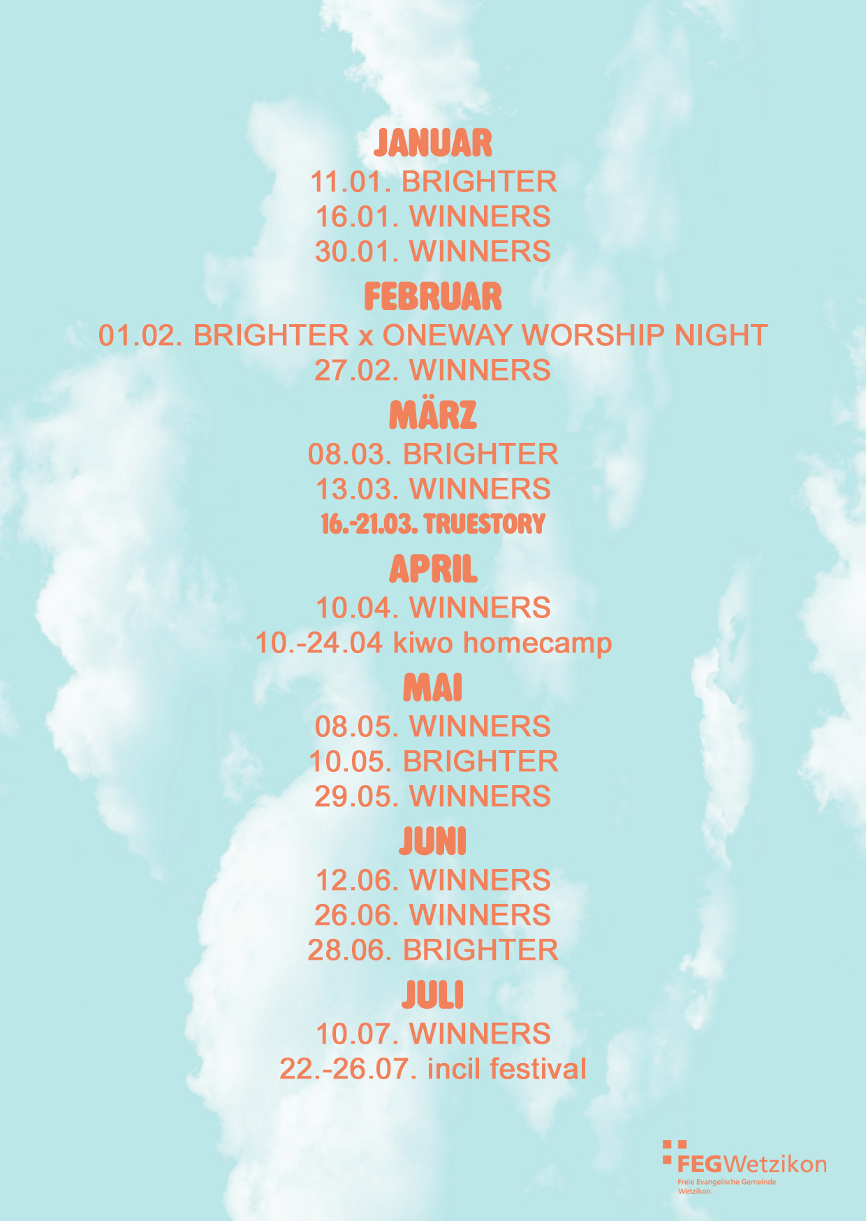 Du bist zwischen 16 und 25 Jahren alt, sehnst dich nach guter Gemeinschaft, tiefgründigen Inputs, feinem Essen und witzigen Spielen? Dann bist du hier im WINNERS genau richtig. Wir sind die WINNERS, die Jugendlichen der FEG Wetzikon. Wir nennen uns WINNERS, weil wir glauben, dass Jesus ein EPIC WIN für unser Leben ist. Er ist das Beste, was unserem Leben passieren kann. Wir sind WINNERS, nicht weil wir besonders fromme oder gute Menschen wären, sondern weil ER besonders ist. Wir gehören zu Jesus Christus, weil er die besten Antworten auf unsere Fragen gibt. Egal ob du schon einmal in einer Kirche warst oder nicht, komm vorbei! Wir würden uns freuen, dich in unserer Community zu begrüssen. Du bist herzlich dazu eingeladen! Wir treffen uns alle zwei Wochen am Freitagabend um 19 Uhr in der FEG. Dazu kommen Camps und vereinzelte besondere Events, zum Beispiel unsere legendäre Weihnachtsparty. Ausserdem findet alle zwei Monate der regionale Jugendgottesdienst BRIGHTER statt, an dem wir gemeinsam teilnehmen. Für einen Überblick über alle Daten, schau dir den Flyer an 😉. Ausserdem haben wir das WINNERS Manifest verfasst. Es soll unsere Vision zeigen, wofür WINNERS steht und wo wir als Jugend von heute hin wollen. Schau es dir an.
